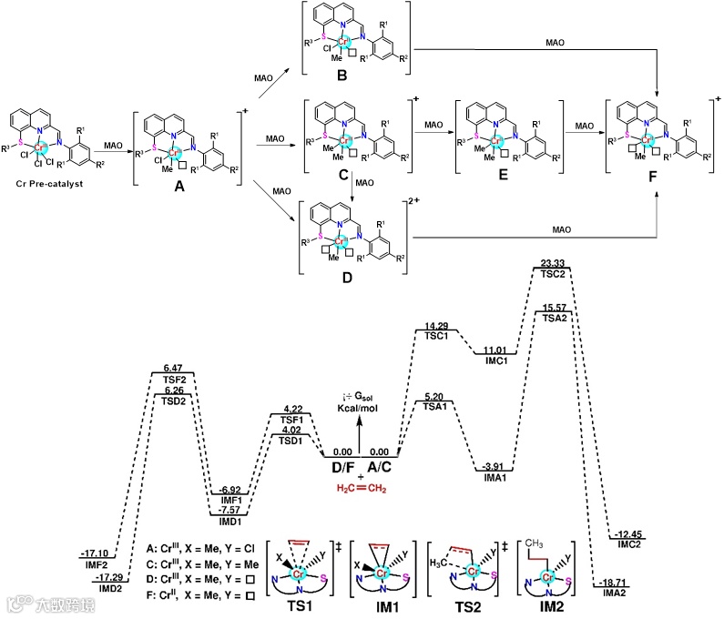 研究人员通过原位紫外对催化剂及活性中心进行了研究,并结合DFT理论计算,提出了双活性中心制备双峰聚乙烯的机理(图 3)。铬金属催化剂与助催化剂MAO相互作用,能够生成A-F六个潜在的活性中心。由于B和E为电中性化合物,不利于乙烯单体配位,因此不可能为存在的活性中心。根据DFT理论计算,C中间体配位的能垒远高于A中间体,因此在低MAO用量条件下,活性中心主要为A,可以制备低分子量聚乙烯腊;而在高MAO用量条件下,D中间体和F中间体配位和插入反应的能垒非常相似,均可能存在,制备了高分子量聚乙烯。这一结果也说明了对于铬系聚烯烃金属催化剂(包括非均相的Phillips催化剂),其Cr活性中心的氧化态很难确定,仍旧是该领域研究的难点。