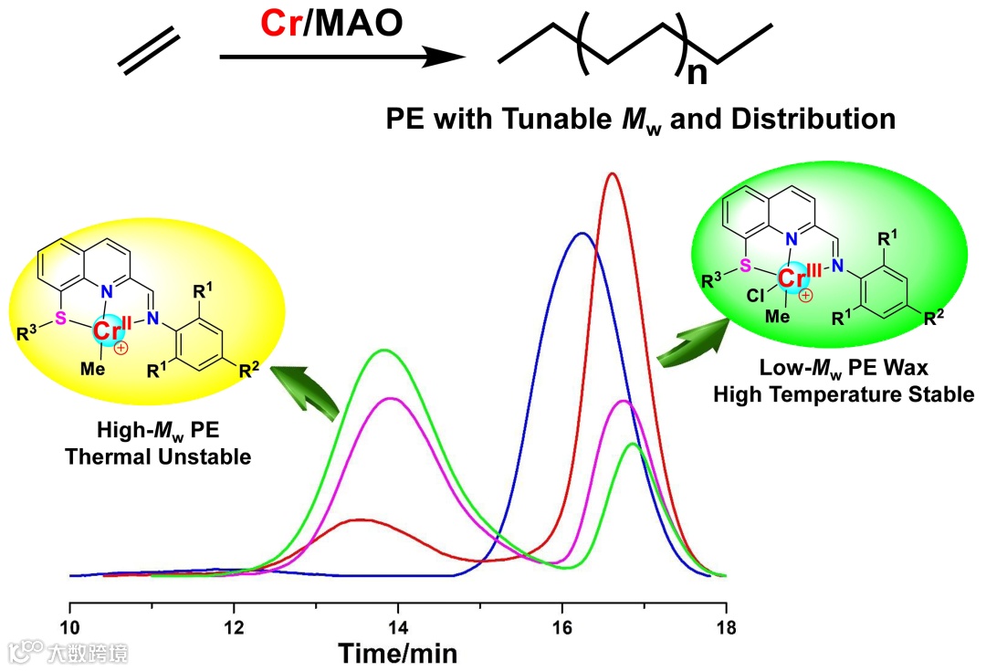 研究发现,通过调节铬金属催化剂的结构和聚合条件,可以有效地调控聚乙烯的结构,制备包括低分子量聚乙烯蜡、超高分子量聚乙烯以及双峰分布的高附加值聚乙烯(图 2)。例如,在较低反应温度(50 °C)、乙烯压力(5 atm)和较高MAO用量(Al/Cr = 1500)条件下,合成了分子量及其分布可调的双峰聚乙烯,兼具优异的力学性能和加工性能;而在较高反应温度(≥ 80 °C)、乙烯压力(40 atm)和较低的MAO用量(Al/Cr ≤ 500)条件下,制备了具有单峰和窄分布的低分子量聚乙烯蜡。