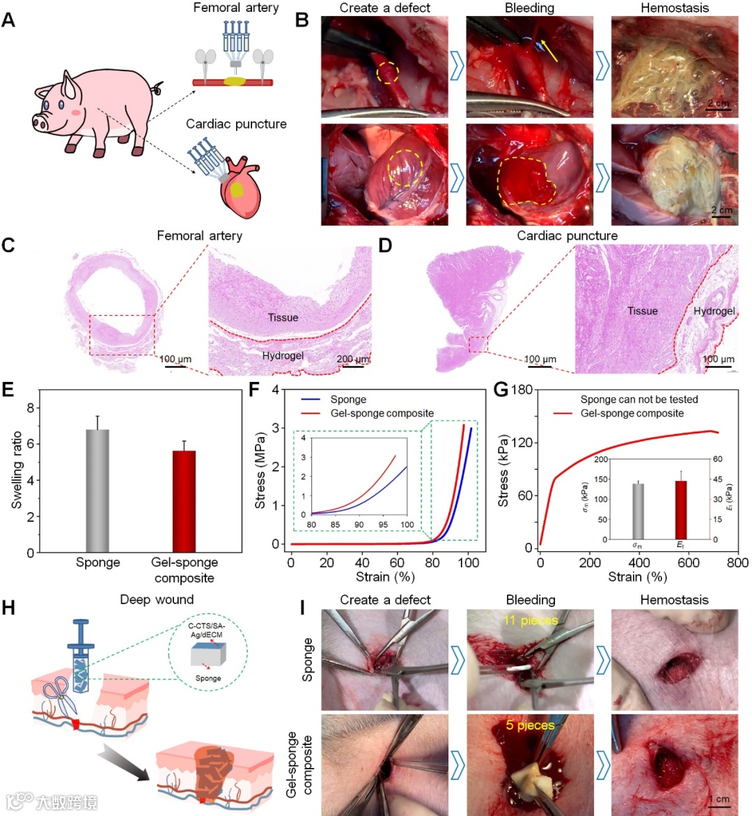 图7. C-CTS/SA-Ag/dECM 水凝胶和水凝胶-海绵复合材料在猪出血模型中的体内止血特性。