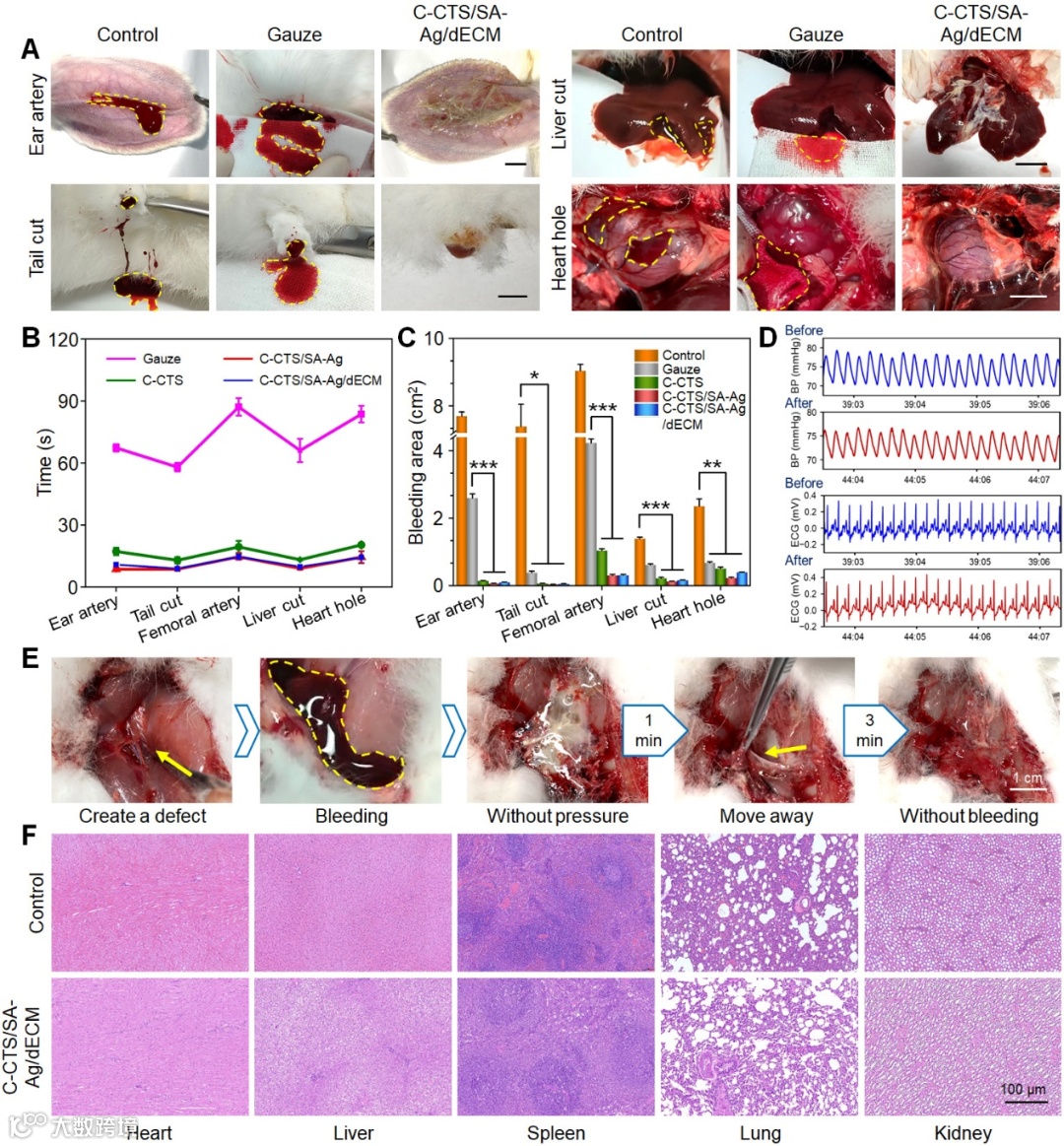 图5. 双仿生止血水凝胶在各种兔出血模型中的止血性能评价。