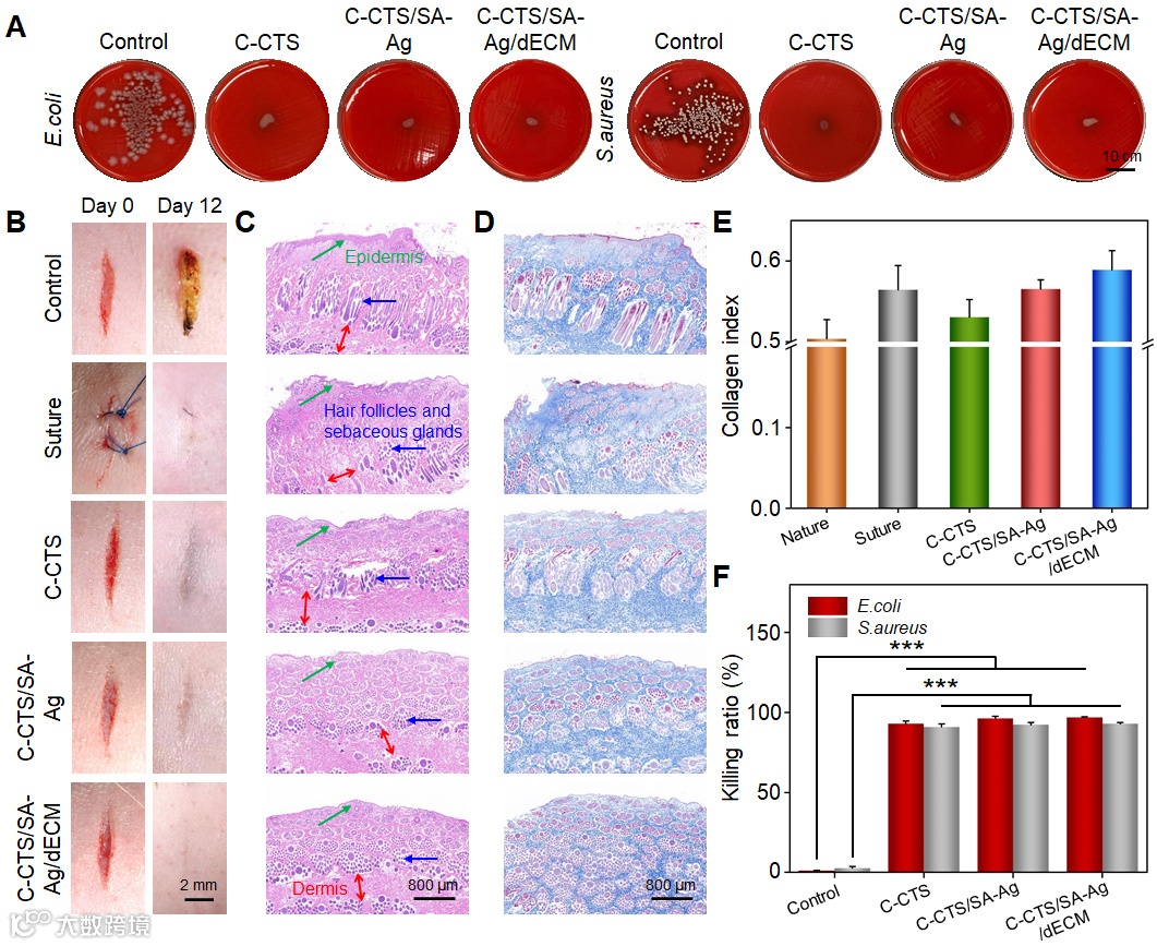 具有抗菌性能的止血密封剂,将非常有利于提高伤口愈合的效率。由于C-CHI和Ag NPs的存在,所开发的水凝胶对金黄色葡萄球菌和大肠杆菌展现出理想的杀菌效果(图6A&F)。鉴于水凝胶具有良好的组织粘附性、抗菌性能和止血性能,研究人员通过构建兔皮肤切口模型,进一步研究了双仿生止血水凝胶的皮肤创面愈合效果(图6B)。各治疗组的创面均处于闭合状态,但修复程度不一致。未经治疗的对照组出现明显的瘢痕不均匀增生。与之形成鲜明对比的是,在C-CTS/SA-Ag/dECM水凝胶处理的伤口部位获得了具有新表皮的再生光滑组织。图6C−D的H&E染色和MT染色结果也进一步证明,C-CTS/SA-Ag/dECM水凝胶在加速皮肤组织再生效果和降低增生性瘢痕率方面具有作为理想伤口敷料的巨大潜力。