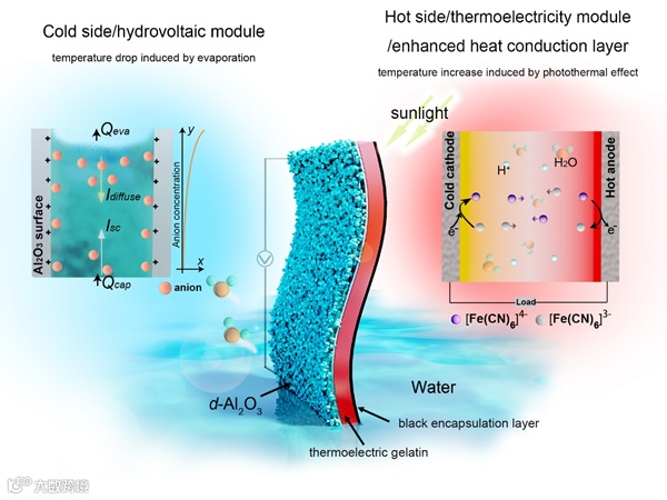 中国科学院苏州纳米技术与纳米仿生研究所的张珽研究员团队在前期湿气驱动的自供能柔性可穿戴传感系统(Nano letters. 2019,19,5544-5552.)、用于柔性传感器件能源供给的水伏发电机(Nano Energy. 2020,72,104663.)以及可利用汗液发电的水伏发电机(Nano Energy., 2021, 85, 105970.)等工作基础上,将柔性离子热电(i-TE)明胶材料与多孔Al2O3水伏发电机结合,利用它们的协同作用构建了一种热传导增强型柔性水伏发电系统。在该系统中,i-TE材料可有效改善水伏发电机与环境之间的热传导。同时,水蒸发消耗热量提供了可靠的温度梯度,为热电模块提供稳定的温差用于产能。此外,该系统可以利用光热转换提升水伏发电机的温度,将输出电压提升至6.4V。