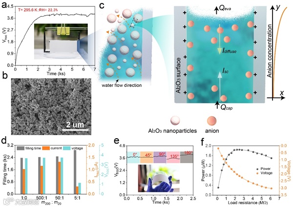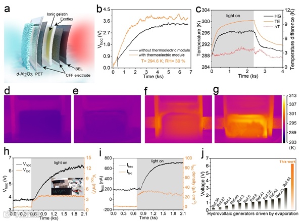 图2. 基于多孔d-Al2O3柔性水伏模块的产电性能。