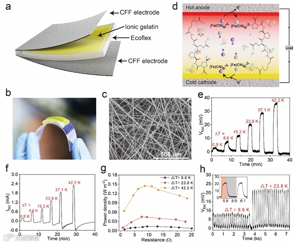 图3. 基于i-TE离子明胶的柔性热电模块的组成及产电性能。