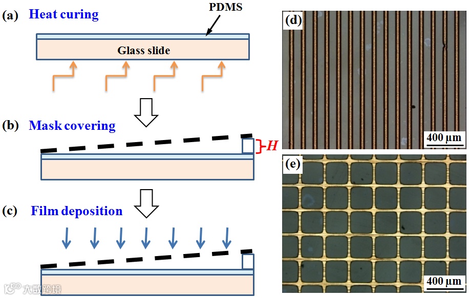 图1 样品制备示意图。(a) PDMS的旋涂和固化,(b) 铜网掩模,(c) 薄膜沉积,(d) 一维铜网照片,(e) 二维铜网照片。