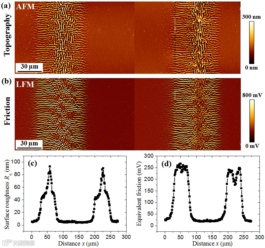 图2 表面形貌与摩擦性能。(a) AFM表面形貌,(b) LFM表面摩擦,(c) 表面粗糙度的变化,(d) 摩擦性能的变化。