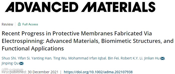 以上成果以“Recent Progress in Protective Membranes Fabricated Via Electrospinning: Advanced Materials, Biomimetic Structures, and Functional Applications”为题,发表在Advanced Materials上。