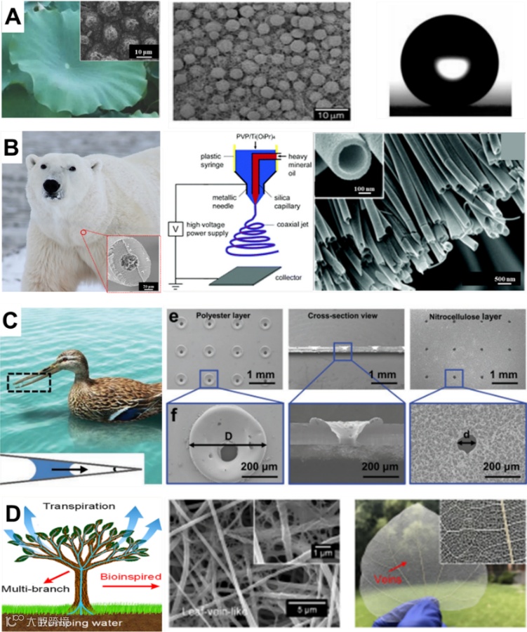 图5. 功能性防护薄膜的仿生设计。A)荷叶的宏观和微观图像,以及通过静电纺丝制备的具有超疏水结构的仿生荷叶薄膜;B) 空心结构的熊毛和通过同轴静电纺丝技术制备具有保温性能的空心结构纳米纤维;C)鸭嘴结构和用于单向水传输的锥形结构的电纺薄膜;D) 基于植物蒸腾作用构建的超快水传输和蒸发的仿生薄膜。
