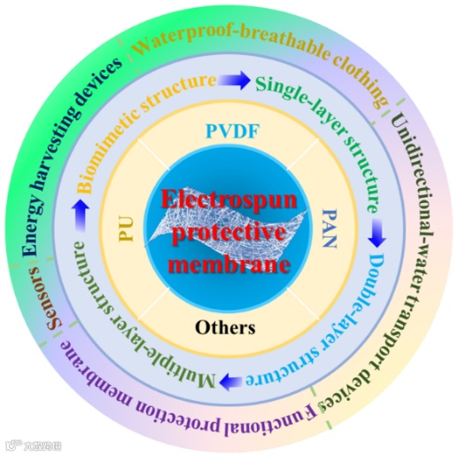综上所述,近20年来,静电纺丝技术在材料、结构和多功能方面得到了很好的发展。所制备的多功能防护膜已广泛应用于个人防护、高端运动、特种作战服等领域。然而,基于绿色加工、多层设计和单丝性能的系统性研究鲜有报道。他们详细通过新材料的开发、仿生技术的发展、先进检测技术的进步,静电纺丝技术存在的这些问题将被一一克服。未来,高性能、多功能静电纺丝保护膜的开发,可为电子皮肤、智能穿戴、高端生物医药、未来集成制造等领域做出重大贡献。