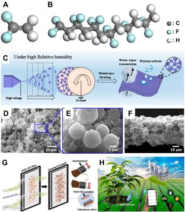 图2. 基于PVDF的防护膜研究。A) PVDF单体,偏二氟乙烯;B) PVDF 聚合物分子链;C)超疏水PVDF防护膜的制备过程示;D) 和 E) 俯视图和 F) PVDF 薄膜的横截面;G) PVDF-TrFE过滤器用于增强颗粒物 (PM)1.0 的捕集;H)用于植物自供电可持续农业系统的透气膜示意图。