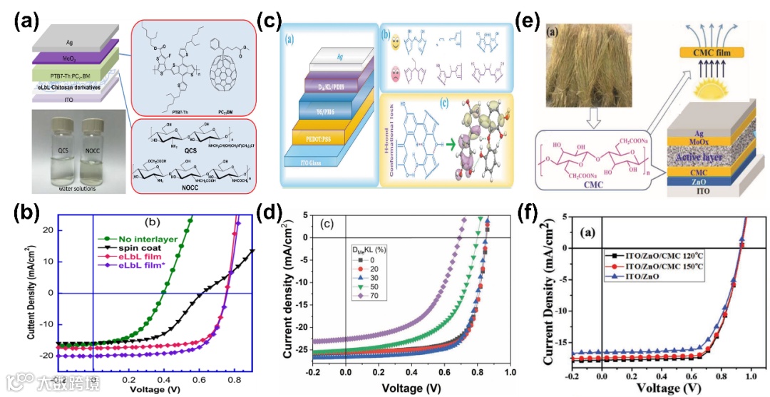 图4 生物质基材料(a,壳聚糖衍生物;b,木质素衍生物;羧甲基纤维素)作为太阳能电池的阴极界面层
