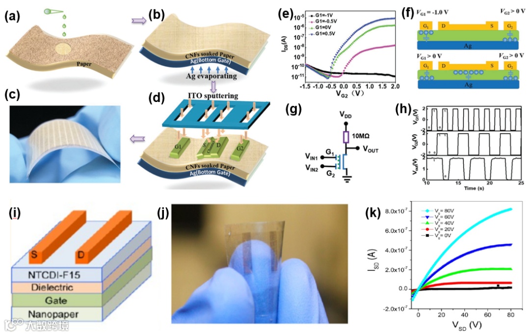 图6生物质基材料(a,纸张;j,纤维素纳米纸)作为薄膜晶体管的柔性基底
