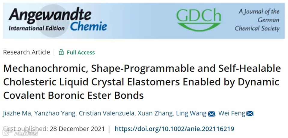 Jiazhe Ma, Yanzhao Yang, Cristian Valenzuela, Xuan Zhang, Ling Wang* and Wei Feng*. Mechanochromic, Shape-Programmable and Self-Healable Cholesteric Liquid Crystal Elastomers Enabled by Dynamic Covalent Boronic Ester Bonds. Angewandte Chemie International Edition, DOI: 10.1002/anie.202116219