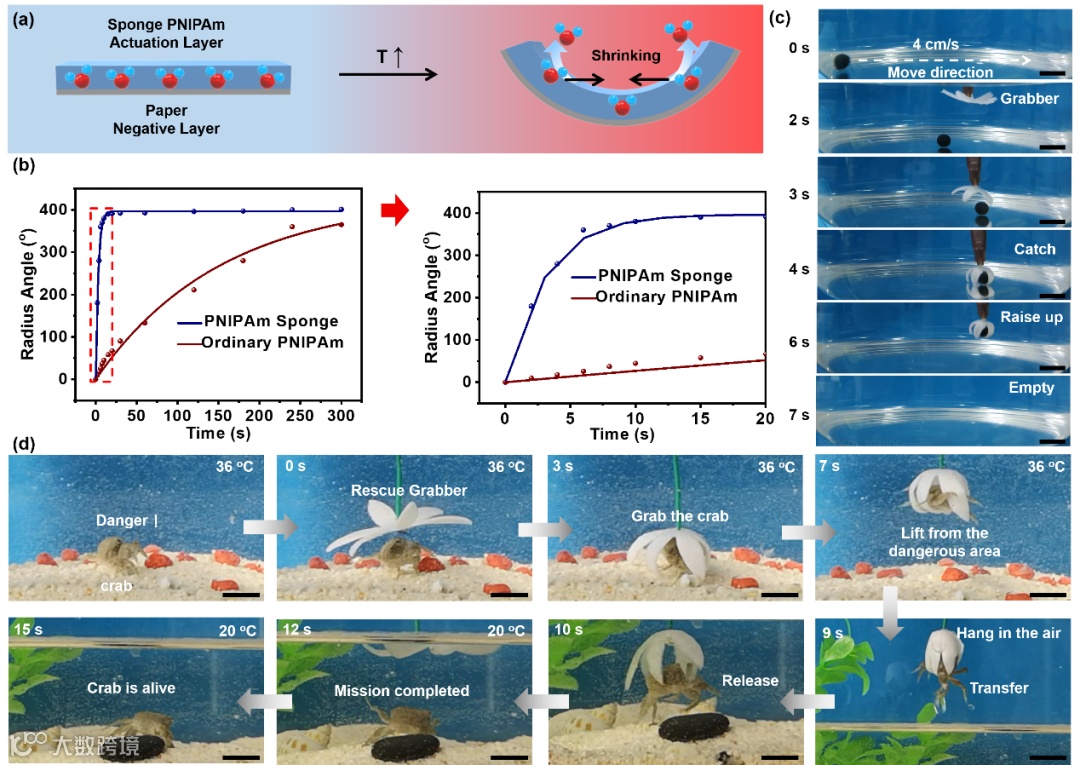 Figure 2. 温度响应凝胶海绵驱动器快速抓取运动物体
