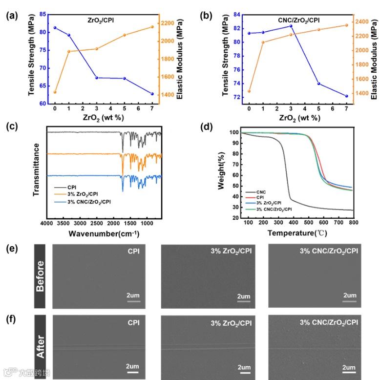 图2 CNC/ZrO2/CPI盖板的力学性能和耐折叠性能