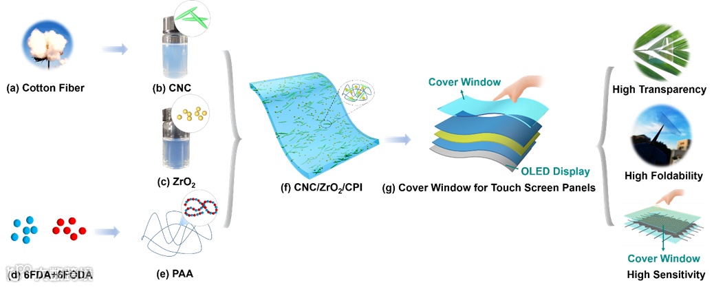 基于此,华南理工大学制浆造纸工程国家重点实验室陶劲松副研究员团队针对现有柔性折叠触摸屏盖板不耐折叠和灵敏度较低的问题,通过将纤维素纳米晶体(CNC)和氧化锆(ZrO2)结合到无色聚酰亚胺(CPI)中,开发了一种高度可折叠和超灵敏的CNC/ZrO2/CPI复合盖板材料(图1)。受弹性理论的启发,在CPI中添加刚性CNC以提高弹性模量,而引入高介电常数ZrO2可改善薄膜的介电性能,从而在提高了盖板耐折叠性的同时,增强了其触摸灵敏度。