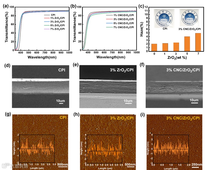 作为柔性触摸屏面板的盖板材料,其光学特性对人机交互有着至关重要的影响。通常,高透明度和高清晰度有利于提高用户的使用体验感。对比分析纯CPI、ZrO2/CPI和CNC/ZrO2/CPI三种薄膜的光学性能和表面性能(图3),结果显示由于CNC和ZrO2的纳米尺寸和与CPI具有较好的相容性,复合盖板仍具有优异的光学性能和较小的表面粗糙度。