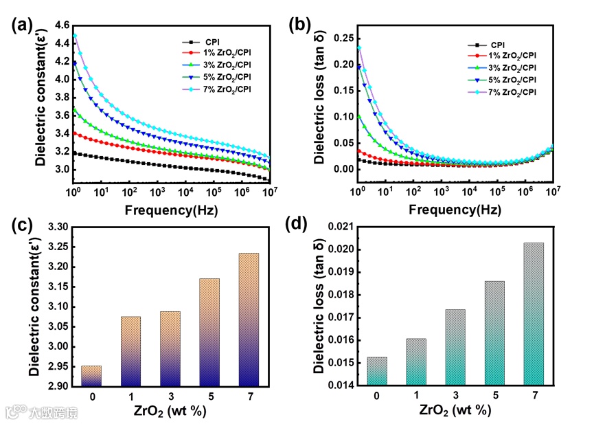 对于电容式触摸屏面板,触摸灵敏度与位于手指和电极之间的盖板层的感应电容密切相关。当厚度不变时,盖板的感应电容由其介电特性决定。因此,提高盖板层的介电性能可以有效地提高触摸灵敏度。作者在CPI中添加了具有高介电常数的ZrO2纳米颗粒,以改善盖板层的介电性能(图4)。通过分析介电常数和损耗,结果显示复合膜的介电常数得到提高。后续进行的应用分析也显示,CNC/ZrO2/CPI盖板在触摸时电容变化更明显,这意味着其触摸灵敏度更高。通过改善和平衡机械、介电和光学性能,该复合盖板可以广泛应用于下一代柔性显示器。