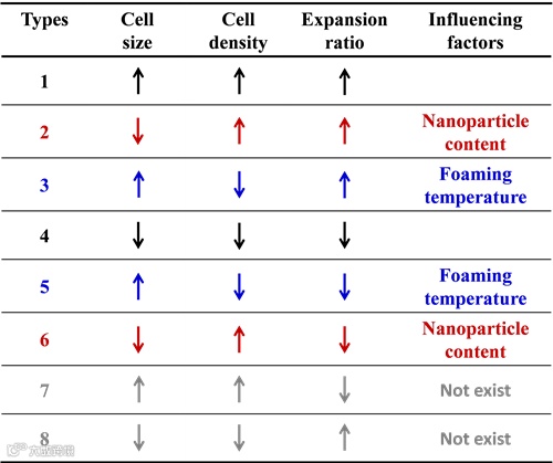 对于第1和第4,虽然三个因素均增大或均减小的情况是存在的,但是这两种变化类型对观察尺度要求比较高,导致实际观察到的实例相对较少。因此,最常见的变化类型是第2、第3、第5和第6四种。以纳米粒子含量和发泡温度作为调节因素为例,简要介绍这四种泡孔结构变化类型及结构转变,将有助于清晰理解泡孔调控的基本方法和一般规律。当纳米粒子含量适度增加时,体系气泡异相成核增强,因此,泡孔密度增大、泡孔尺寸减小、膨胀倍率增大,泡孔结构变化类型为第2种;当纳米粒子含量进一步增加时,虽然体系气泡异相成核增强,泡孔密度增大,但由于较大的纳米粒子含量增大了体系的硬度,限制了泡孔生长,导致泡孔尺寸减小、膨胀倍率减小,泡孔结构变化类型转变为第6种。当发泡温度提高时,泡孔生长的驱动力增大,因此,泡孔尺寸增大、泡孔密度减小、膨胀倍率增大,泡孔结构变化类型为第3种;当发泡温度进一步提高时,体系的熔体强度降低,泡孔出现明显聚并,导致泡孔尺寸增大、泡孔密度减小、膨胀倍率减小,泡孔结构变化类型转变为第5种。
