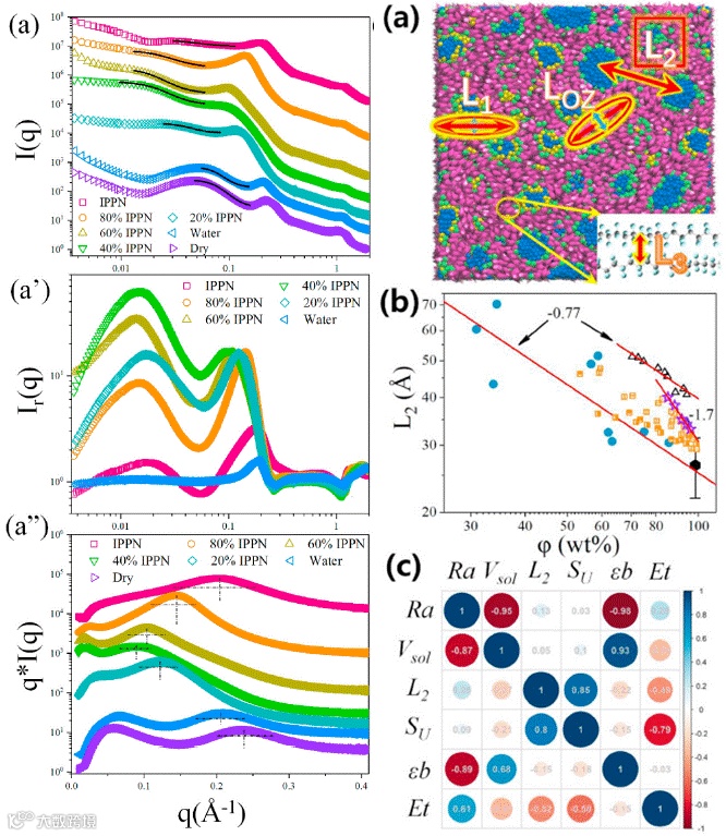 图 1. Nafion溶胀膜的SAXS结构解析(左a-a’’),微观结构分子动力学模拟特征尺寸标识、磺酸跟离子聚集尺寸的标度关系以及微观结构尺寸与膜的溶胀、机械性能的关联矩阵(右a-c)。
