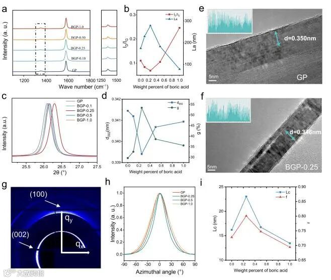 在2000 ℃下退火,硼元素的加入有助于GPs中石墨晶体结构的形成,使得石墨烯的晶体结构更加致密有序。通过拉曼、XRD和WAXS对纯GP和BGPs的微观结构和晶体结构参数进行了表征。研究发现,适量硼的加入对GO的石墨化过程有积极效应,可有效修复结构缺陷,促进石墨晶体的生长,提高石墨化程度。