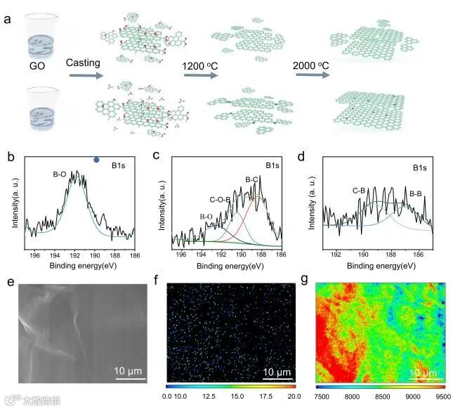 通过XPS分析了含硼石墨烯膜(BGPs)退火过程中硼酸的结构演变, 在较低的退火温度下,硼元素主要以B2O3的形式存在于石墨烯的空隙中。随着退火温度的升高,B2O3开始分解,硼原子逐渐扩散到间隙位置和取代位置。硼的WDS元素分布图显示了硼原子在BGPs中的均匀分布,没有聚集。