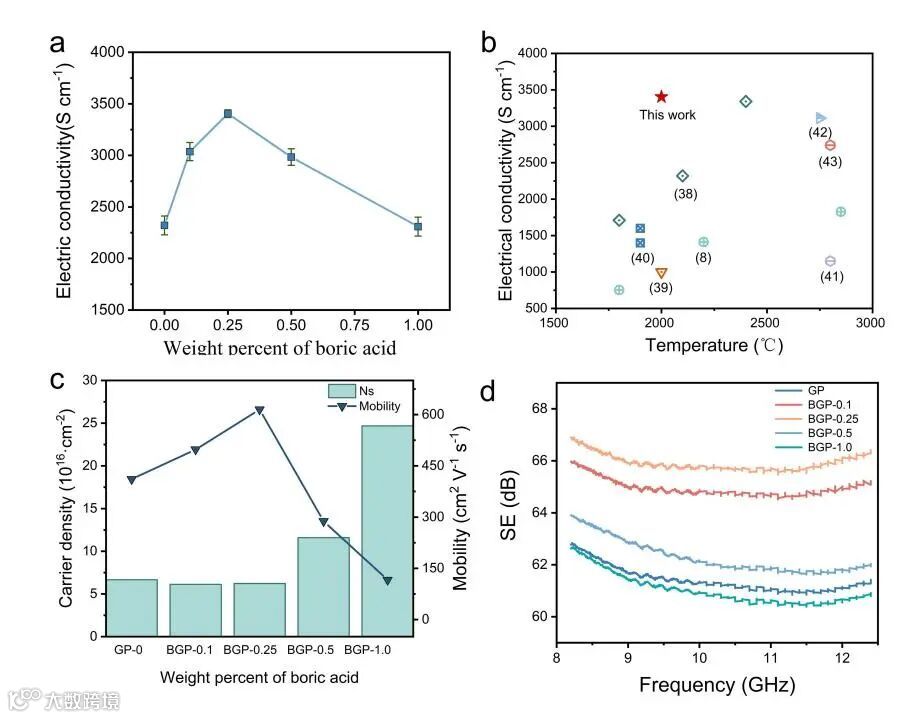 2000℃退火后的BGP-0.25的电导率约为3400 S cm-1,比纯GP高47%,导电率的提升主要归功于硼的催化石墨化效应。硼催化石墨化效应可以用于制备高性能电磁干扰屏蔽材料,以及其他电极材料。在8 ~ 12 GHz范围内,石墨烯膜(16 um)的SE值由62.67~61.11 dB(纯GP)显著增加到66.90~66.13 dB(BGP-0.25)。