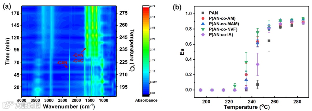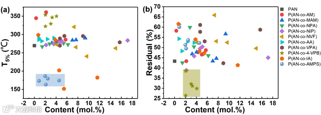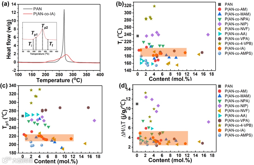 高性能碳纤维是重要的战略材料,被誉为黑色黄金。碳纤维材料具有超高的拉伸强度和模量以及较低的密度等优点,被广泛应用于航空航天、体育器材和休闲用具等领域。各种碳纤维类型中,尤以聚丙烯腈基(PAN)碳纤维应用最多,研究最广泛,这主要得益于原料易获得、产碳率高和性能优越等特点。然而PAN均聚物由于其较低的亲水性以及热处理过程中过度集中的放热难以直接作为碳纤维的前驱体使用,通常通过共聚的方式,引入能提高分子柔顺性、降低环化反应集中放热的共聚单体,从而得到热性能和可纺性均满足要求的高分子前驱体。理想的前驱体共聚物需满足环化温度低、耐热性好、放热速率低和碳产率高等要求,但目前缺乏对PAN前驱体共聚物的系统性研究,面对众多可与丙烯腈形成共聚物的候选单体,传统的试错法在一次研究里通常只能单一地针对某一个或少数几个单体进行研究,使得前驱体共聚物的研发和创新速度都极为缓慢。