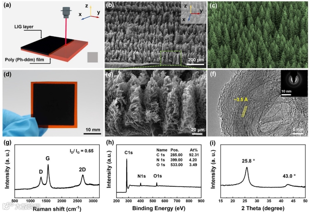 近日,受自然界中具有极高太阳光利用效率的针叶森林结构启发,该团队通过碳材料多级结构调控,构建了一种由多孔石墨烯“树”密排列成的三维石墨烯薄膜(Forest-like LIG)。这种独特的多级结构使得入射光在“树”之间以及“树枝”之间进行多次反射,显著减小了石墨烯的光反射。结合石墨烯本身的光热特性,Forest-like LIG在太阳光全波长范围内表现出优异的吸光率(平均吸光度达到99%)和光热转换性能(在一个太阳光强度的氙灯照射下平衡温度达到90.7 ± 0.4 °C)。