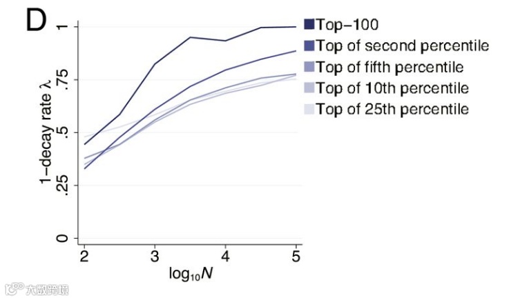 基尼系数是经济学中用来评价收入平等的,越高说明收入不平等越严重。该文用其来评价论文每年获得的新引用数目上的不平等。图2A说明了,科学界中引用数越高的论文,其获得的引用的过程,也越发不均等,当一个领域有更多的论文发表时,特定论文,尤其是那些高引用论文拿到了相对更多的新增引用;而B指出,当某领域发表更多的论文后,该领域论文引用数的排名变的更加稳定(从而相关性更高),每一篇新论文的发表都不成比例地增加了已经被引用最多的论文的引用。