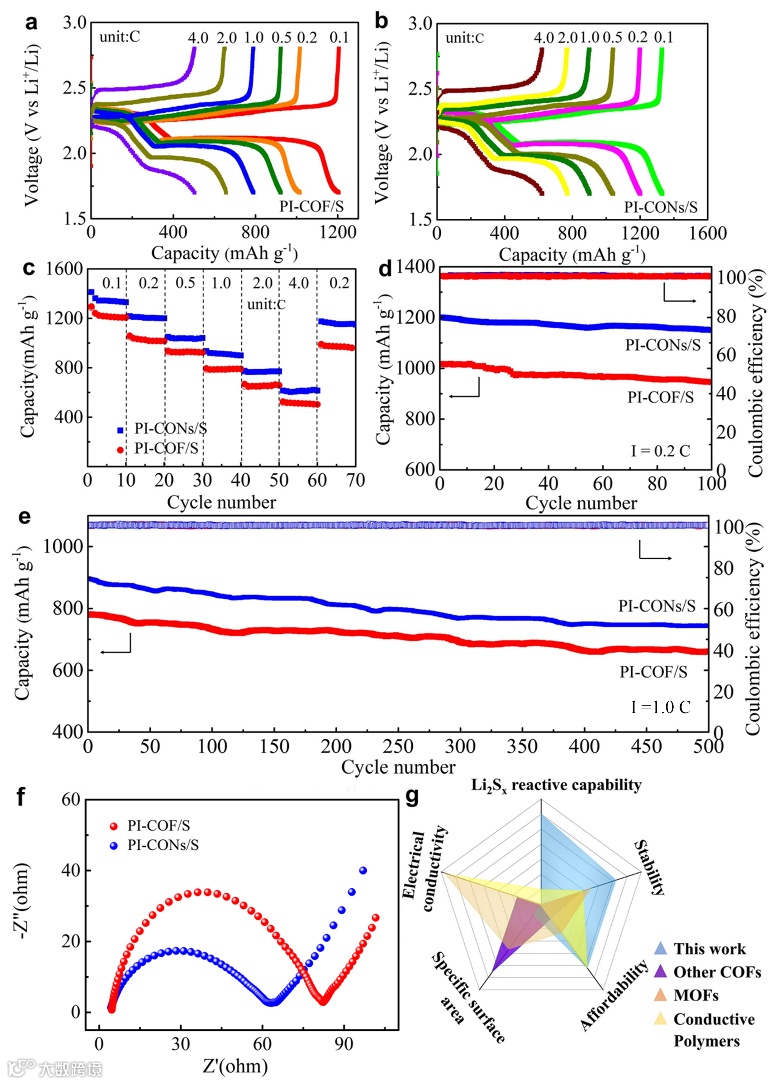上述具有二维共轭多孔结构的PI-COF和PI-CONs含有丰富的羰基活性位点,能够与中间体多硫化物产生较强的相互作用,从而成功将可溶性多硫化物限制在正极材料区域内,实现锂硫电池性能的有效提升。研究人员通过理论计算研究证实了上述羰基与多硫化物的强相互作用,并通过一系列电化学实验测试了其性能 (图4)。结果表明PI-COF和PI-CONs均具有很高的可逆容量和出色的倍率性能 (在0.1 C下容量分别为1330/1205 mAh g-1,在4 C电流密度下容量分别为620/503 mAh g-1),并且表现出稳定的循环性能 (在0.2 C下经100圈循环,容量保持96%),上述优异的锂硫电池性能超越了绝大部分已报道的有机及聚合物锂硫电池载体材料。