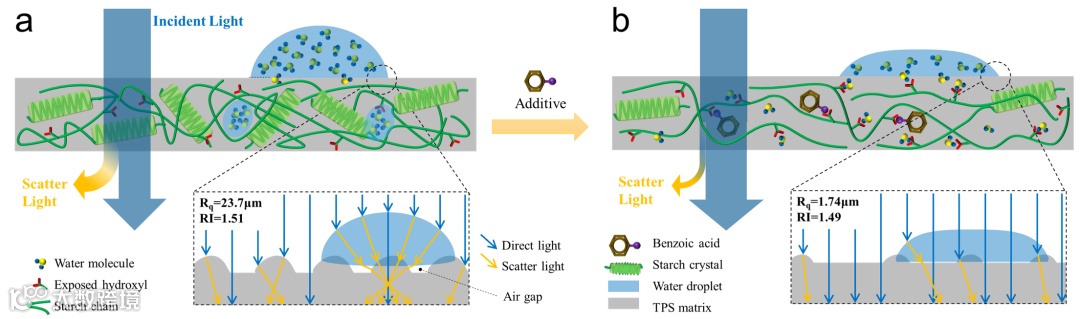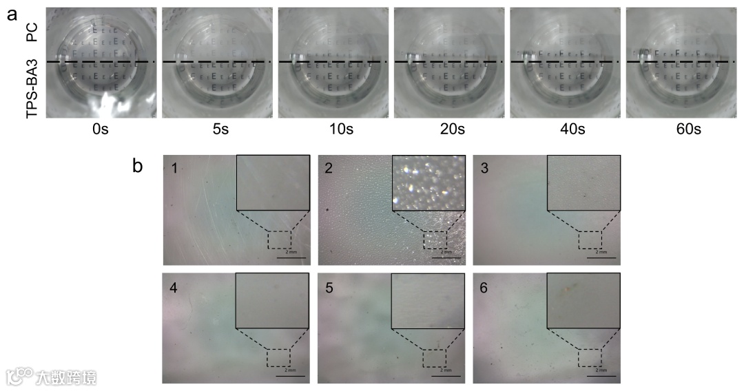 图3 TPS-BA本征亲水材料的透明特性和机理