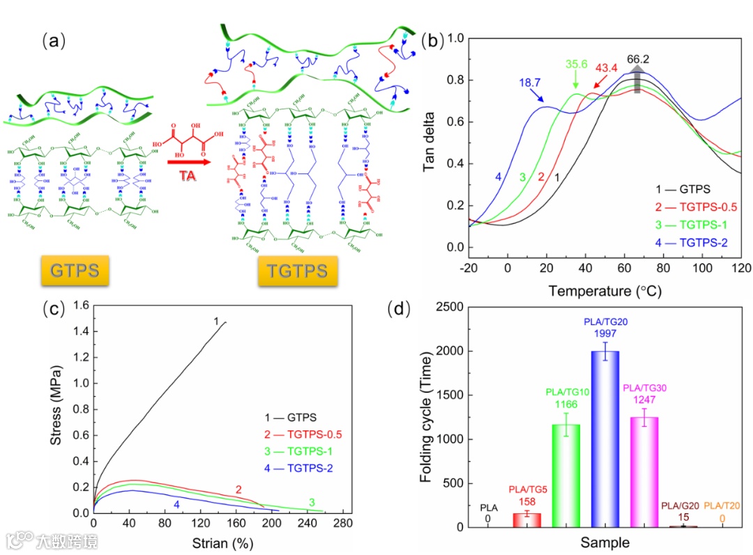 为探究少量多元酸的引入对TPS-TA性能特征实现由硬脆向柔韧转化的机制,该课题组发现,多元酸在PBAT/TPS-TA兼降黏、增塑、界面增容等多重效应(Zhang et al, Polymer Testing, 2019,76, 385-395.)。此外,更为关键的要素是TA的加入对TPS的氢键网络结构进行破坏和重构,促使TPS性能上由脆性塑料向柔韧性热塑性凝胶转变。进一步研究表明,多元酸(具有氢键给体和受体)能与淀粉和甘油形成多重氢键,将原本的淀粉-甘油氢键网络重构为淀粉-甘油和淀粉-多元酸-甘油的具有明显双Tg的类似“软-硬段”结构的淀粉交联网络,随着多元酸的引入,在TPS-TA体系形成了具有排斥占主导的氢键二级相互作用,实现淀粉由僵硬到柔软的转变,从而使热塑性淀粉凝胶获得温度响应特性、低模量和高流动性等新特征。同时,通过这种网络结构的改变,增加了单一淀粉分子间的距离和多重氢键的供体和受体方向多样化,削弱了淀粉分子内和分子间氢键作用力,提高了凝胶网络的自由体积,促进了其分子链间的滑移运动,使得TPS-TA具有突出的柔性特征,因此作者首次将其定义为淀粉热塑性凝胶(TGTPS) (Si et al. European Polymer Journal, 10.1016/j.eurpolymj.2021.110731)。将其与PLA共混,发现其分散能力与在PBS,PBAT基体具有一致性特征,TGTPS能以微纳米尺度均匀分散在PLA基体中。令人惊奇的是,TGTPS可以在外力诱导下有效地诱发银纹和剪切屈服形变来耗散能量,承受外界大部分应力,从而降低PLA基体承受的应力值,促使PLA基体经历180˚反复折叠而不断裂,产生了shish-kebab结构,从而实现了脆性聚乳酸的柔顺性。TGTPS添加量达20wt%时,PLA/ TGTPS共混物耐受180˚反复折叠的次数由纯PLA的0次提升到2000次。该研究结果进一步验证TGTPS在脆性脂肪族聚酯基体中柔顺增韧具普适性特征,也为高性能PLA共混物的制备提供新途径。