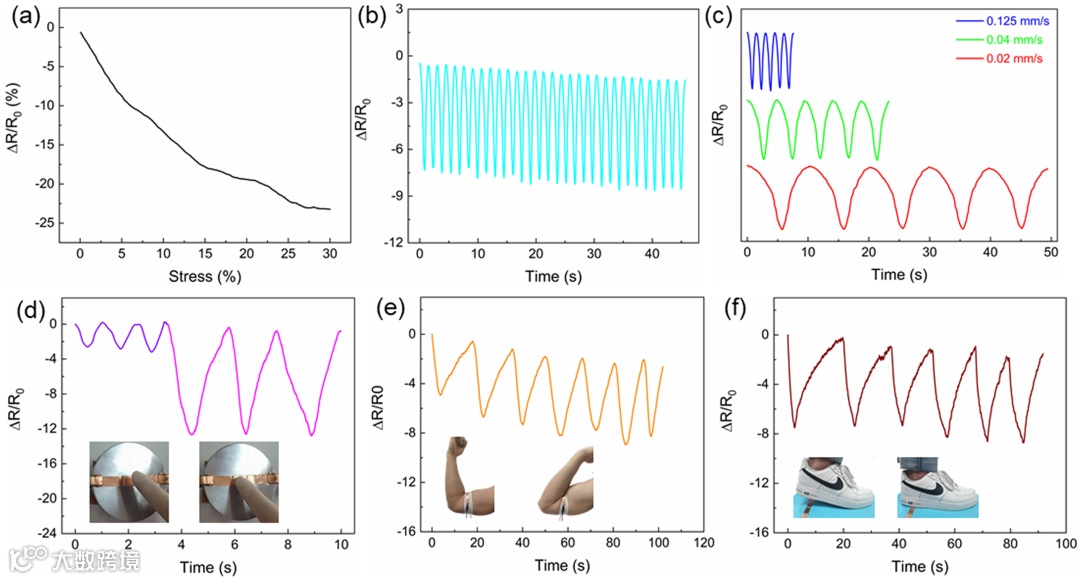结合上述工作,该课题组认为改变TPS中氢键作用力是调节TPS凝胶的有效手段。除了有机酸对TPS氢键作用力具有显著影响外,在制备TGTPS时,氯化锌在纯甘油中仅能溶解而不能完全电离自由移动的Zn2+和Cl-,这一策略可以获得具有离子对效应的甘油-氯化锌溶液。利用离子对效应提高甘油溶剂极性,进而强化甘油对淀粉的塑化作用,制备出具有高力学性能、透明性、灵敏环境响应性的新型淀粉热塑性凝胶(SGZn)(Si et al Composites Part B)。结果发现,离子对效应的引入明显降低TPS分子链间的氢键作用力和黏度,从而改变淀粉凝胶的由弹性向黏性行为主导方向转变的粘弹性行为,赋予其断裂伸长率提升6倍、透明性(˃87 %)、导电性(10-3 S/cm)。此外,离子对效应也具有弱化TPS氢键作用力的特征,从而增加SG与水的缔合能力,伴随SGZn从环境吸湿而水份含量增加,体系能电离自由移动的Zn2+和Cl-,从而实现了其高效的湿度响应能力(响应速率提升360倍)。这种柔性和导电能力的良好结合,赋予SGZn凝胶灵敏的应变传感能力,不仅可以监测人体大范围的运动,例如步行、膝盖和手肘的弯曲,还可以监测一些细微的人体力学运动,并在较宽的温度范围内(-30~80℃)具有稳定性。因此,这项工作丰富了淀粉热塑凝胶氢键作用力调控策略,同时也为制备高性能的淀粉基应变传感器提供了理论基础。