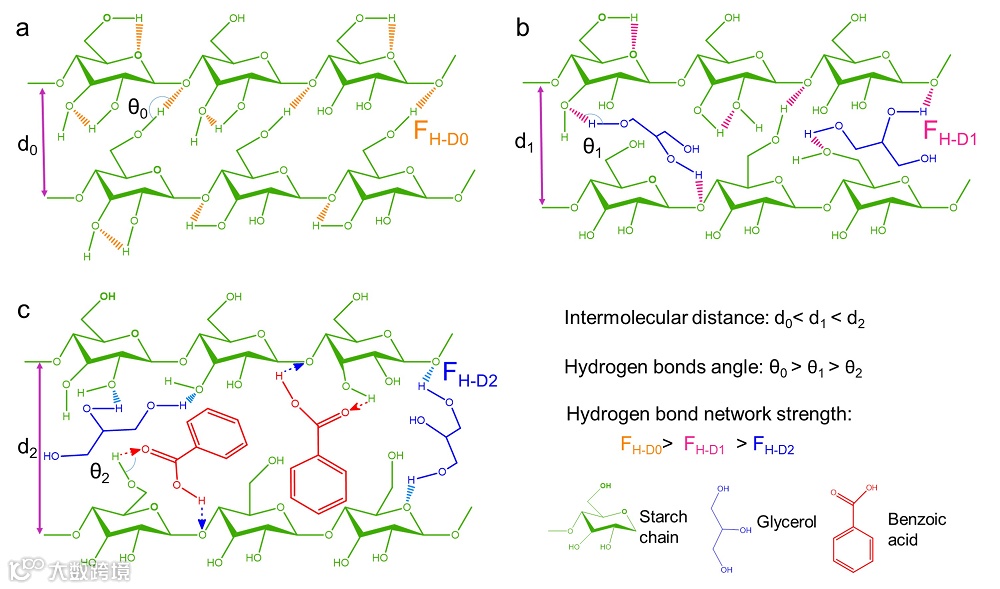 以上研究改变了热塑性淀粉脆性特征,基于对酸/淀粉/甘油热塑体系的黏弹性行为研究而定义了淀粉热塑性凝胶,通过弱化TPS氢键作用力及丰富氢键种类的多样化,实现了淀粉由刚硬变为柔顺的特征,拓宽淀粉热塑性凝胶制备策略和应用范围。这种调控淀粉热塑凝胶中氢键作用力的方法为淀粉基材料的绿色改性及新应用提供新思路,也为价低、高性能的全生物降解塑料的批量化制备提供新方法。这一系列的研究工作分别由华南理工大学机汽学院的2018届硕士生林泽声、2020届硕士生贺衍、2021届硕士生钟全发和2019级博士生司万杰完成,张水洞教授为论文的第一/通讯作者。上述工作是在国家自然科学基金(51773068,52173098)、环保型高分子材料国家地方联合工程实验室、广东省自然科学基金(2021A1515010551)和广州市科技计划(基础研究, 202002030143)资助和支持下完成。淀粉热塑性凝胶体系复杂的氢键作用力描述和构图,得益于华南理工大学材料学院童真教授悉心指导和化学化工学院唐浩教授的深入讨论。