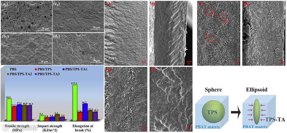 在前期探索研究中,该课题组通过反应挤出制备一种新型热塑性淀粉(TPS-TA),诸如酒石酸、苹果酸等多元酸的加入降低淀粉分子链间的缠结和分子量,实现降低TPS的黏度和提高流动性目的,确保TPS-TA能均匀分散在脂肪族聚酯基体。研究结果表明,当TPS-TA与PBS经双螺杆共混挤出,椭球体的TPS-TA以平均粒径约0.5 μm (200目淀粉颗粒的平均直径为50-80 μm)的形态均匀分散在PBS基体中,且相形貌由PBS/TPS的“海-岛结构”转变为亚均相形态,从而提高共混物对外应力的能量耗散作用,PBS/TPS-TA的冲击强度由2.8 KJ/m2提升到6.3 KJ/m2。这一结果表明,刚性淀粉经过氢键弱化处理,可增韧聚酯(Zhang et al, Carbohydrate Polymers, 2019,206,827-836.)。该课题组进一步,将 30份TPS-TA与70份PBAT共混以期应用于高性能的全生物降解薄膜中。在PBAT/TPS-TA薄膜吹制过程中,均匀分散在PBAT基体中的TPS-TA(平均粒径为184 nm)受纵向取向力的诱导,表面能被PBAT紧密包裹而由椭球状向囊泡形态转变,显著提高PBAT/TPS-TA薄膜的力学、光学和阻隔性能。正是基于良好的两相相容性和形貌均匀性,与PBAT薄膜相比,薄膜厚度为25±3μm 的PBAT/TPS-TA薄膜的断裂伸长率提高了100 %,横向拉伸率超过1000%,透气性由6.92×109 cm3·cm/cm2·s·Pa下降到3.72×109 cm3·cm/cm2·s·Pa,紫外光透过率也由47.6 %下降到23.5 %,批量吹制的薄膜晶点数则小于5Pics/cm2, 雾度低于8%,热封强度高于18MPa。这种低价、高性能和可批量热成型的全生物降解材料在一次性包装袋和食品包装材料中具广阔的市场前景(Zhang et al, Polymers for Advanced Technologies, 2019,30(4):852-862.)。