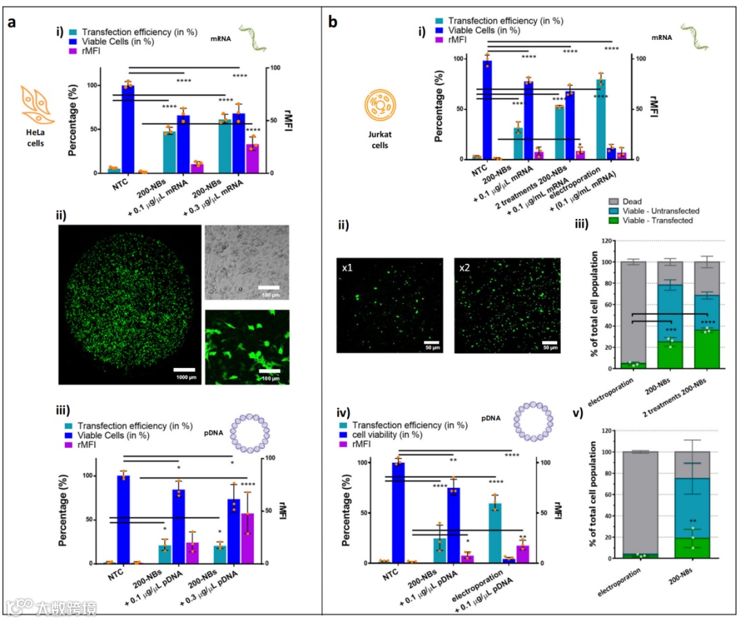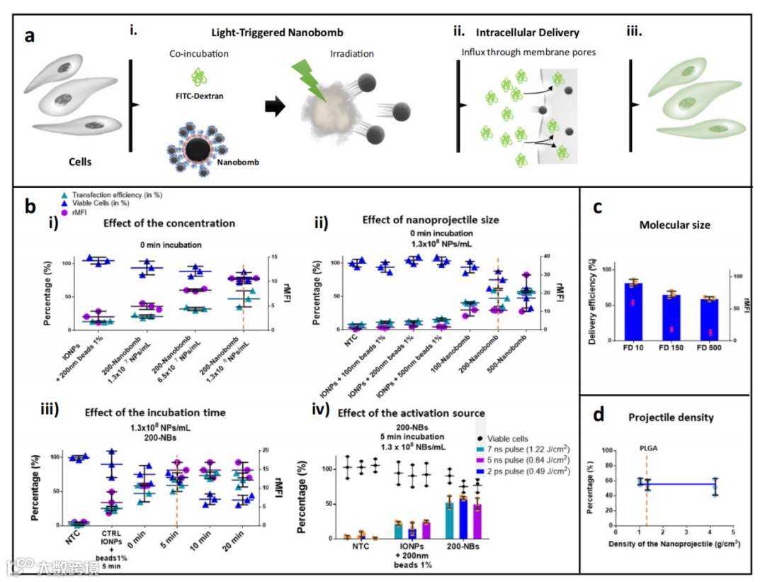 为了提高大粒径生物大分子如信使核糖核酸(mRNA)、质粒脱氧核糖核酸(pDNA)的胞内递送效率,他们进一步提出了复合纳米粒与光协同生成纳米微泡“推动”生物大分子进入细胞内的递送新思路,与传统依靠分子“被动扩散”进入细胞的递送方法相比,发现mRNA、pDNA胞内递送效率分别显著提高了约6倍和8倍(如图2)。