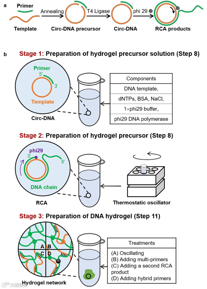 图1. 基于酶促滚环扩增反应的DNA水凝胶制备策略示意图
