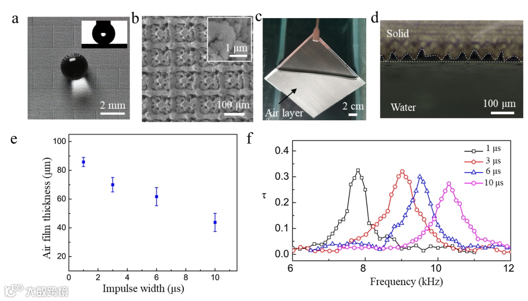 荷叶具有季节依赖性、结构脆弱性、物理参数难以调控等弱点。而且,其自身本征振动会对增强效果产生不良影响,因此寻找替代性人工材料具有重要的实用价值。为此,他们选用了超疏水铝片。首先,铝的模量比荷叶大五个数量级以上,可以忽略自身振动模态对透射效果的影响。其次,铝片的可加工性很强,可以灵活地改变自身质量和表面疏水微结构,从而灵活调控工作频率。作者分别用激光刻蚀、湿法刻蚀和喷涂发制备了不同的超疏水结构,展示了其在不同频率下的增透效果。结果如图3所示,其声学透射效果视频2所示,当超疏水结构面朝向水时,可捕获气层形成超表面,其声压透射为600 mPa,当不存在铝片或者超疏水面背向水时,无法捕获气层来构成超表面,声压透射为40 mPa,表明了超疏水效应引起的声学增透效果。