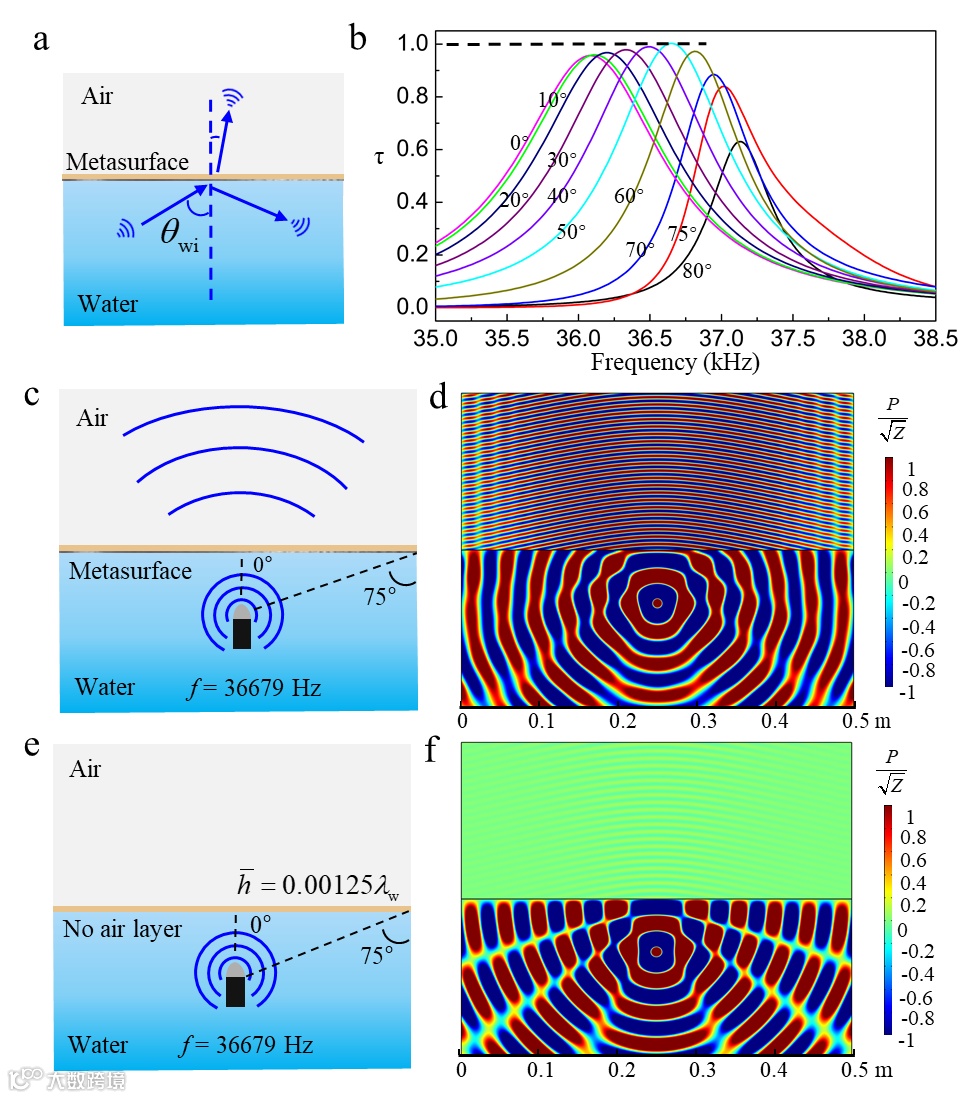 作者还证明,此超表面具有允许声波从水向空气的宽角度透射的特点。其宽角度透射增强是源于水气间较小的全反射临界角(约13.6°)。声波从水中以不同角度向空气中入射时,根据斯涅耳折射定律,其通过微米气层的路径并没有大的改变,声波相位改变没有发生大的变化,因而对工作频率和增透效果并没有太大的影响。如图3c-d所示,他们使用了水下声源其入射角度从0到75°,和没有超表面对比(图3e-f),总体依然显示了较好的声波透过性能。