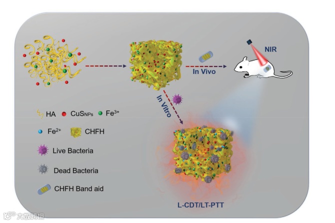 致病菌感染严重威胁着公众健康,基于光热杀菌的治疗策略因其高效且可降低致病菌耐药性的发生而越来越引起科研和医护人员的重视。但是光热杀菌过程引起的高温会损伤周围正常组织和细胞,针对这一问题,刘亚青教授团队构建了一种由致病菌触发的多功能水凝胶,通过与局域化学动力疗法(L-CDT)相结合实现了低温光热(LT-PTT)高效杀菌。该工作将具有光热特性的硫化铜纳米颗粒(CuSNPs)与透明质酸(HA)和Fe3+-EDTA复合物混合制备了多功能水凝胶。所制备水凝胶对致病菌表现出很好的吸附性,为后续L-CDT的发生提供了很好的基础。积聚在凝胶表面的细菌分泌透明质酸酶来分解HA并释放Fe3+,Fe3+被细菌的微环境还原成Fe2+引发芬顿反应,产生的羟基自由基引发L-CDT的抗菌作用。进而结合CuSNPs的光热特性,实现可控的LT-PTT抗菌。构建的方法在提高抗菌效率的同时,最大限度地减少了对正常组织的损害。进一步将凝胶制作成创可贴,可以有效地促进金黄色葡萄球菌感染伤口的愈合过程,证实了其临床应用的巨大潜力。