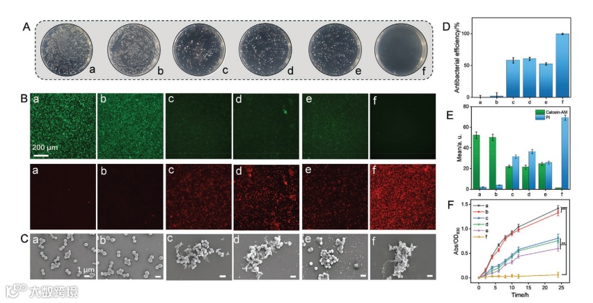 图2. 体外抗菌研究:(A)菌落平板计数,(B)荧光活/死成像,(C)SEM图,(D)抗菌效率计算,(E)平均荧光强度,(F)菌落生长曲线。