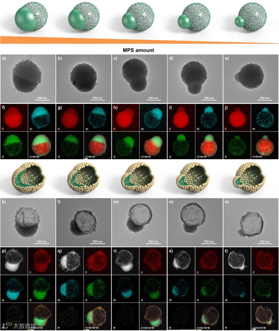 作者巧妙利用前驱体中同时发生的(烯基)自由基聚合反应和(三甲氧基硅烷)水解聚合反应,实现了有机硅在聚苯乙烯纳米颗粒表面的选择性岛状生长,随后经过包裹聚多巴胺及高温煅烧得到具有选择性中空结构的纳米机器人。此外,通过精确调控两种聚合反应的动力学,可以实现对岛状有机硅尺寸和数量等参数的精准调节,进而可以根据不同需求合成具有可调拓扑结构的多功能纳米机器人。