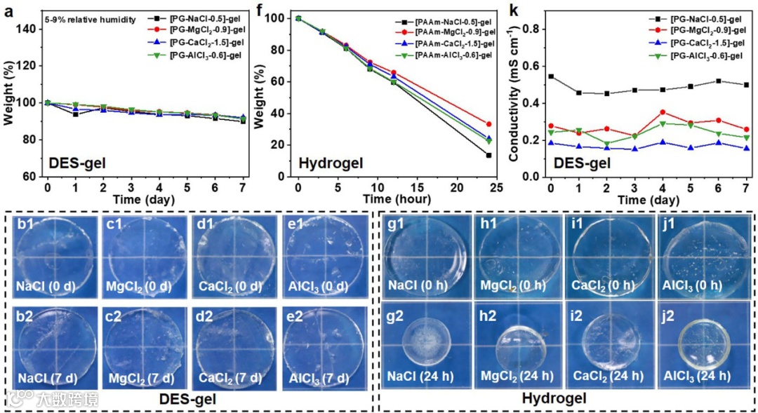相比于传统的水凝胶,制得的DES凝胶具备优异的环境稳定性。DES凝胶的抗干燥性能通过监测凝胶质量损失进行表征。在开放的环境中储存七天,DES凝胶仍可保持其初始重量的90%和尺寸稳定性(图2a-e)。相反,水凝胶的重量持续下降,尺寸明显减小(图2g-j)。此外,DES凝胶在开放空气中储存七天后导电性基本保持不变(图2k),进一步证实了DES凝胶的环境稳定性。
