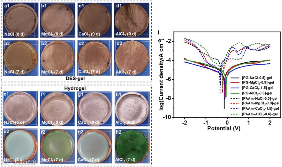 水凝胶离子导体中的溶剂水通常会腐蚀金属电极界面,这严重破坏了其在电子领域中的应用。DES是非水溶剂,因此制得的DES凝胶能够保持良好的化学稳定性,特别是抗金属腐蚀性。为了验证DES凝胶的抗金属腐蚀性能,研究人员将DES凝胶与铜片接触,并放置在开放空气中七天,发现DES凝胶能够保持尺寸稳定性和光学透明度,并且铜片也并未发生腐蚀(图3a-d)。然而,水凝胶在密闭空间(用于保水)中储存七天后却对铜片产生了严重腐蚀(图3e-h)。为了进一步量化DES凝胶和PAAm-MCln-y水凝胶的耐腐蚀性能,研究人员又进行了恒电位极化实验(图3i)。结果显示,相比于水凝胶,DES凝胶具备优异的耐腐蚀性。以上结果表明,DES凝胶具有良好的化学稳定性,这对其在柔性电子领域中的应用至关重要。