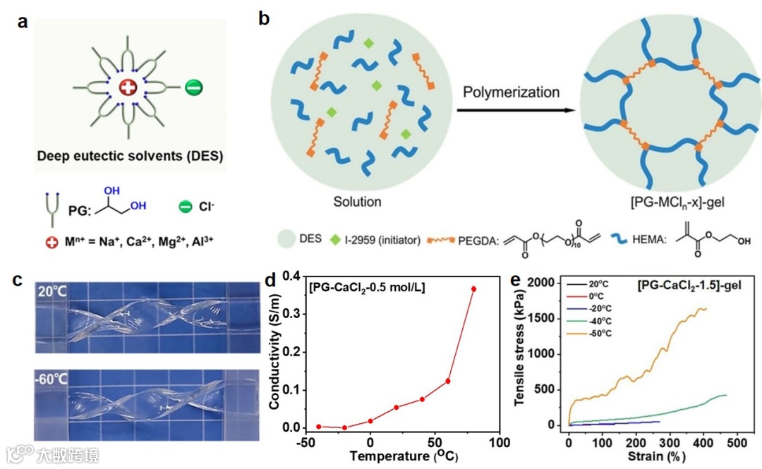 工作中利用丙二醇(PG)和多种金属盐制得DES溶剂。如图1a所示,PG打破了金属离子与氯离子之间的静态相互作用,形成了基于新的氢键结构的团簇。随后以DES为溶剂,甲基丙烯酸羟乙酯(HEMA)为单体,聚乙二醇二丙烯酸酯(PEGDA)为交联剂,制得了DES凝胶(图1b),该凝胶在低温下仍保持良好的柔性、导电性以及可拉伸性(图1c-e)。