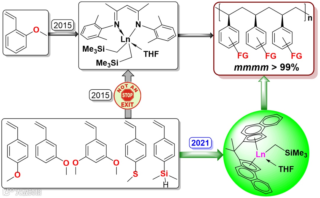 极性单体中的氧或氮等杂原子极易与其聚合催化剂活性中心配位形成稳定的络合物而使催化剂毒化失活。因此,开发极性单体高选择性配位聚合的催化剂是非常重要又富有挑战性的研究课题。中国科学院长春应化所崔冬梅、李世辉研究员课题组在该领域开展了大量的工作,特别是设计含有杂原子侧臂的限制几何构型稀土催化剂,借助杂原子侧臂与中心金属的作用削弱其与极性单体的鳌合,实现了极性苯乙烯高间规选择性均聚合及共聚合,活性高、并得到高分子量聚合产物 (Chem. Commun. 2015, 51, 4685-4688; Macromolecules 2016, 49, 781-787; Angew. Chem. Int. Ed. 2017, 56, 2714-2719; Chem. Eur. J. 2017, 23, 18151-18155; Macromolecules 2019, 52, 9555-9560; Macromolecules 2020, 53, 19, 8333–8339; Macromolecules 2021, 54, 1754-1759)。极性苯乙烯全同选择性聚合发展相对缓慢,除了结晶速率低、熔融温度低,导致产品应用受限,最主要的原因是催化全同选择性聚合的催化剂必须能提供大的空间位阻,而这可能导致催化活性的淬灭。如何打破催化剂这种固有的冲突是目前研究的难点。迄今为止,只有一例关于稀土配合物催化邻甲氧基苯乙烯全同选择性聚合的报道,只因邻位的甲氧基和双键同时与中心金属形成s-π配位模式,既增加了空间效应又活化了活性中心,遵循特殊的杂原子辅助“自活化”机理 (Angew. Chem. Int. Ed., 2015, 54, 5205-5209)。但对位和间位取代的极性苯乙烯无法形成这种配位作用,故其全同选择性聚合还未见报道。