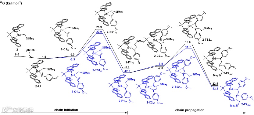 DFT计算表明对-甲氧基苯乙烯首先与中心金属形成Gd-σ-O配位,随后快速翻转为双键与Gd-η2-C=C配位,极性基团并没有导致毒化,因为中性催化剂活性中心的Lewis酸性低于阳离子型催化剂,削弱了中心金属与极性基团Lewis碱相互作用。另一方面,大位阻桥连双茂结构在中心金属钆周围构成了较大的配位空间,迫使极性苯乙烯在一个方向上插入,对甲氧基苯乙烯全同选择性聚合起到关键作用(图3)。这是第一个不遵循“极性基团活化”机制的极性单体全同选择性聚合的例子。