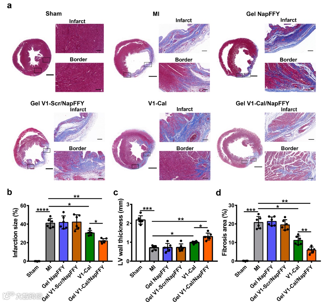 V1-Cal/NapFFY对心室重构的治疗效果如图6所示,Gel V1-Cal/NapFFY治疗可明显降低心肌梗死面积,增加左室壁厚度,抑制心肌纤维化。