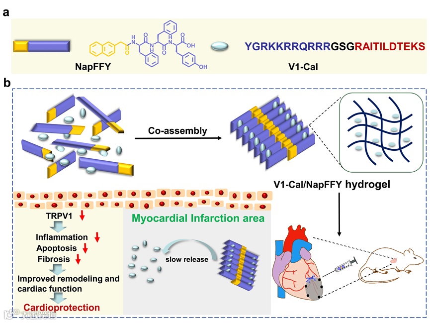 心肌梗死后的心室重构目前仍是非常棘手的临床问题。虽有研究表明,TRPV1抑制肽V1-Cal可以改善心肌缺血后损伤,然而由于其半衰期很短,限制了其在长期心肌保护中的应用。张野教授和梁高林教授课题组设计了一种新型V1-Cal超分子多肽水凝胶体系。该体系通过共组装V1-Cal与Nap-Phe-Phe-Tyr-OH成胶因子,形成稳定的超分子多肽水凝胶。该水凝胶体系通过多点心肌注射的方式给药,可以在心肌梗死区域缓慢释放V1-Cal,抑制TRPV1的过度活化,减轻心肌梗死后早期的炎症和凋亡,减少纤维化,促进血管生成,明显改善了心肌梗死后重塑和心脏功能(图1)。这种新型V1-Cal超分子水凝胶体系,有望开发成为有效改善心肌梗死后心室重构的治疗手段。